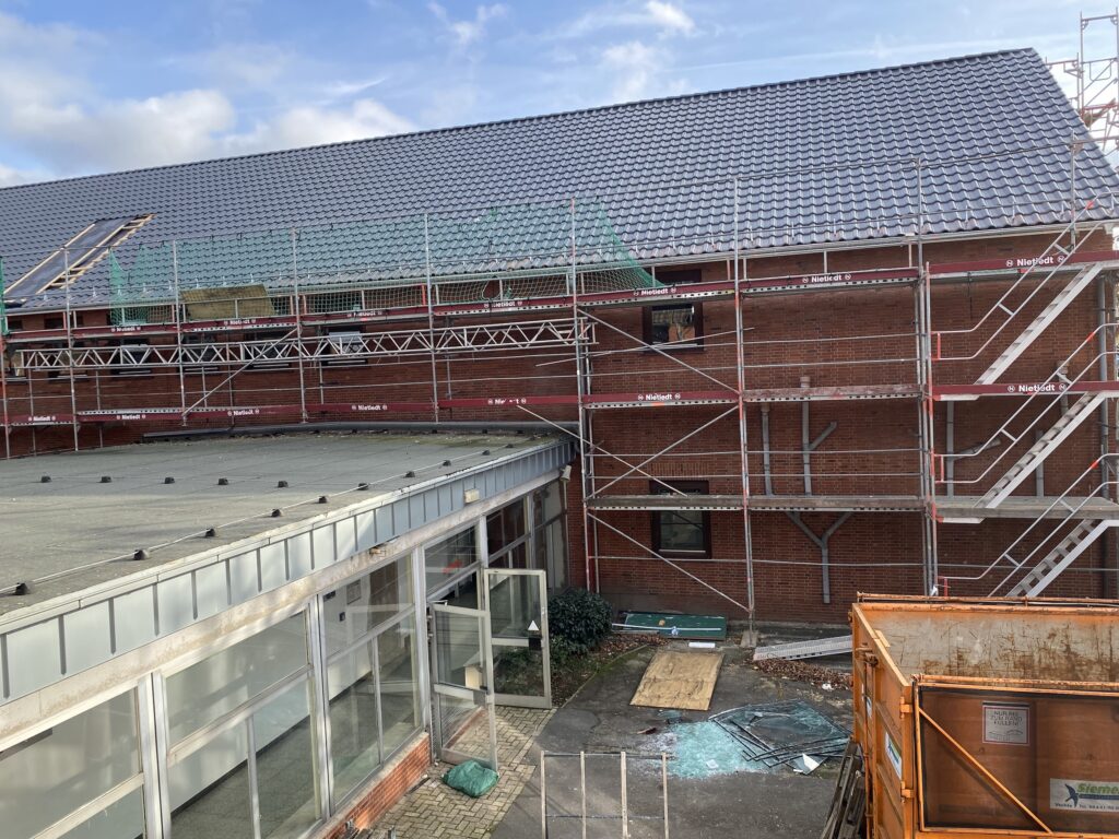 Die Umbauarbeiten im Innenhof/an der dortigen Fassade schreiten voran. Das Dach ist fast neu gedeckt. Der Verbindungsgang und einige Räume zum Innenhof haben neue Fenster bekommen.
