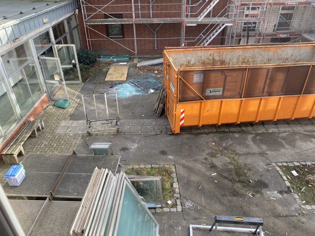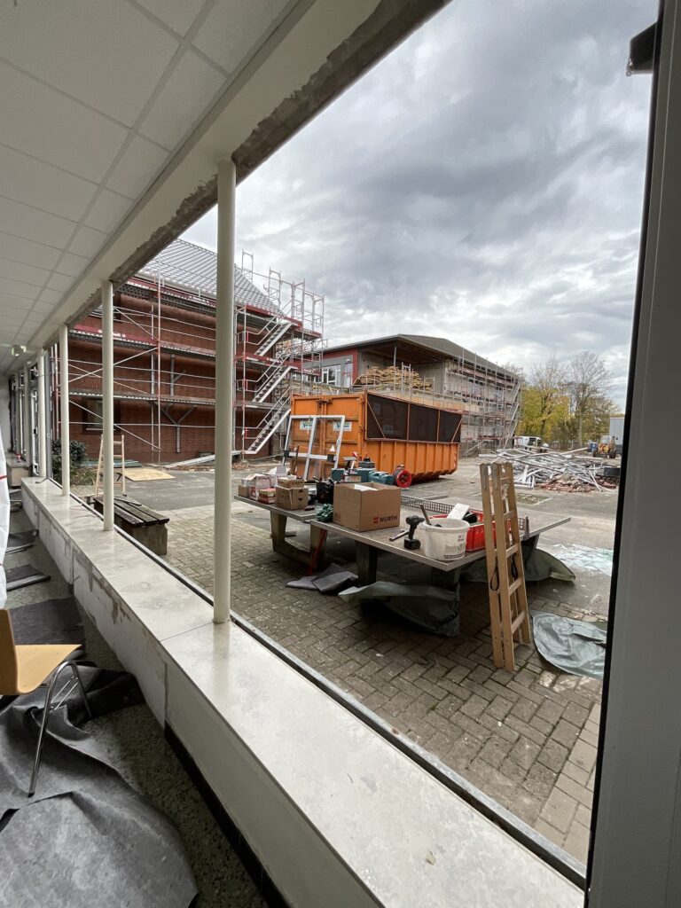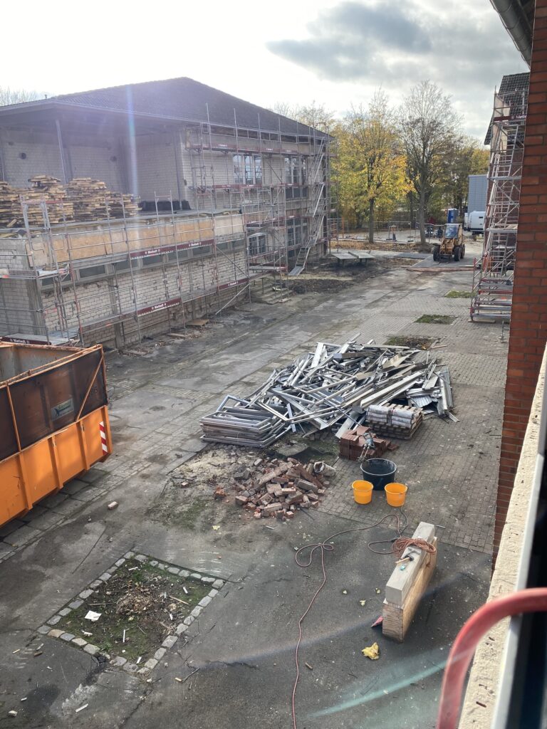 Während der Schulzeit werden wir gerade im Gebäude „gut durchgerüttelt“: Die Erdarbeiten schreiten weiter voran und auch an der Außenfassade im Innenhof wird jetzt gearbeitet.